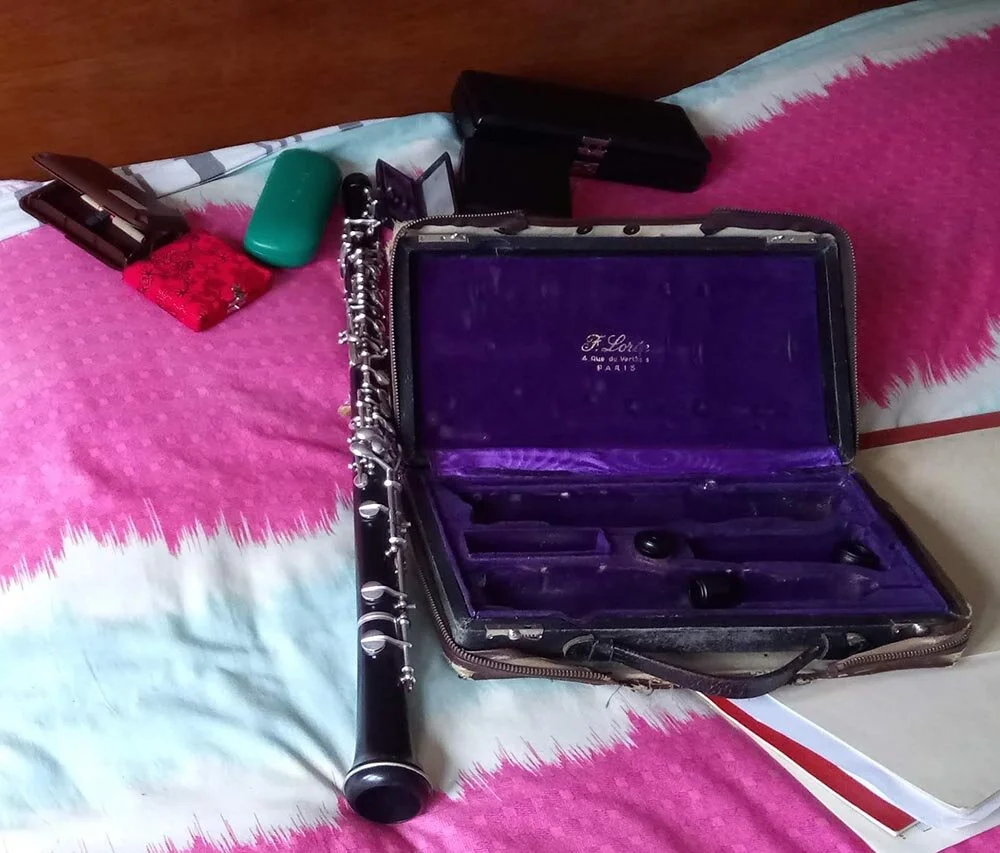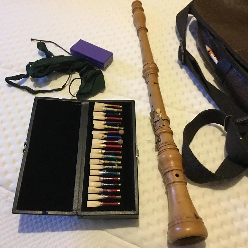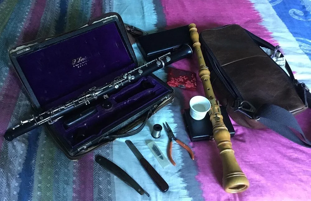 Yonna’s Kit - This pic has it all - baroque and modern oboe with reeds, reed cases, the swab to clean out the oboes after playing, and even reed making tools laid out - a real hard core reed day for both modern and baroque oboe it seems on that occasion - with reed adjustments going on that I used the tools for.