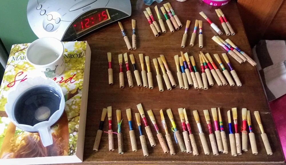 An assortment of modern oboe reeds both long and short scrape - being tested and put in order of best to worst - along with reed soaking cups of water, and a book to have a little read when I need a break from breaking in reeds.
